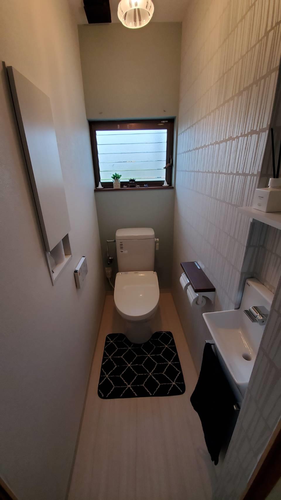 床と腰壁がタイルでしたので掃除が大変との事と新たに手洗いと収納ボックスを取り付けさせてもらいました。